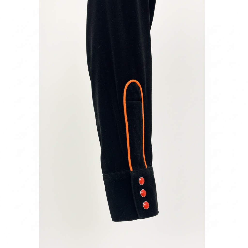- Black velvet body with contrast orange velvet yoke