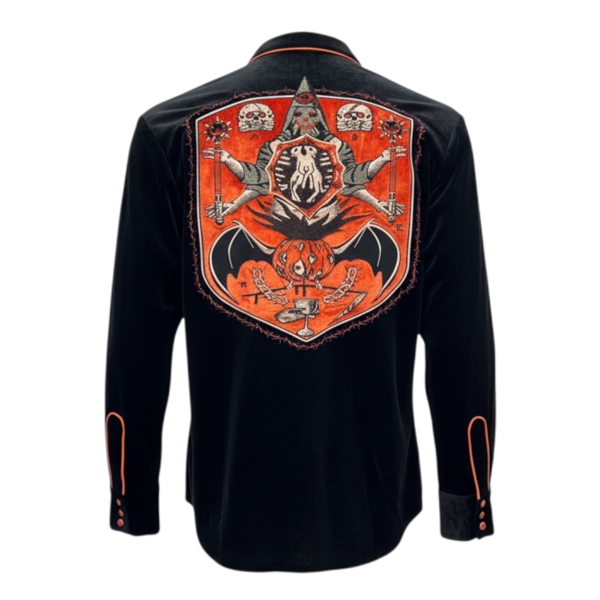Turn it around and the statement escalates. The back features a large, shield-shaped graphic panel in burnt orange and black—an elaborate, ritualistic crest layered with skulls, occult symbolism, and winged imagery. It feels like a back patch from a forbidden biker cult in velvet.