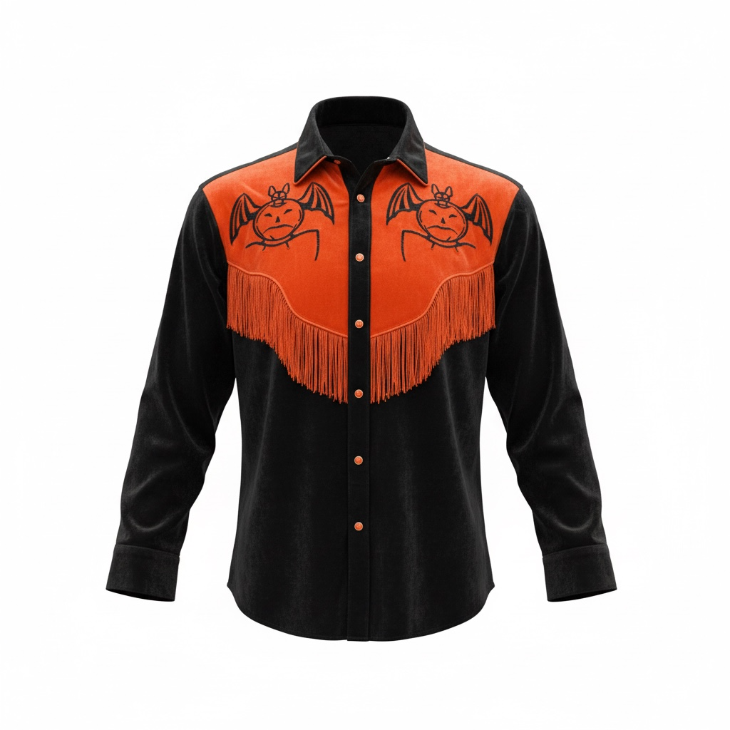 Across the front, twin bat-winged jack-o’-lanterns are embroidered in bold black thread—equal parts Halloween relic and desert demon. The sweeping curved yoke is finished with dense orange fringe that moves with every step, giving it that stage-ready, spotlight-catching presence. Custom orange snap buttons run down the front and cuffs, tying the palette together with a sharp, high-contrast finish.